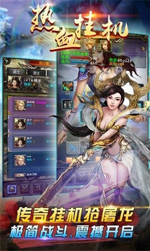 絢麗的游戲界面,為你打造完美魔幻世界!戰(zhàn)、法、道,三大職業(yè)任你選!多變的PK技能、豐富的玩法和剌激的副本BOSS等你來(lái)體驗(yàn)!快下載《熱血掛機(jī)HD》締造巔峰傳說(shuō),打造不朽傳奇吧!玩法和剌激的副本BOSS為一體?!皯?zhàn)士,道士,法師”三大職業(yè),行會(huì)戰(zhàn),華麗特效滿(mǎn)屏呈現(xiàn),讓我們一同締造巔峰傳說(shuō),打造不朽的傳奇!