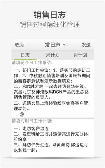 日志:團(tuán)隊(duì)成員可以將日志匯報(bào)給自己的領(lǐng)導(dǎo),領(lǐng)導(dǎo)可以進(jìn)行回復(fù)和點(diǎn)評(píng)