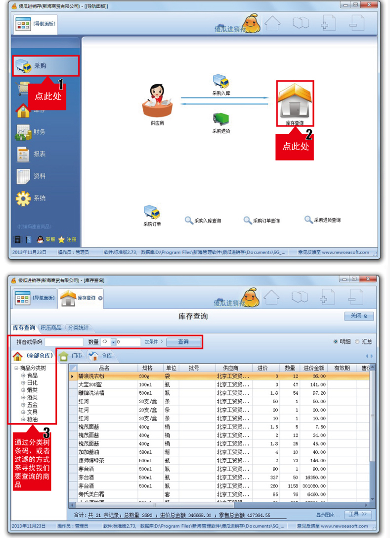 3.1點(diǎn)擊采購(gòu)按鈕 點(diǎn)擊庫(kù)存查詢按鈕