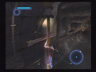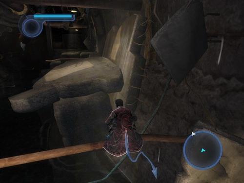 一路前進,注意不要掉的水溝里(途中需利用空中的鋼管跳過去),在盡頭跳到石頭上,然后再跳到前面的管道上,出現(xiàn)提示后按R1可飛過斷掉的管道,之后也是如此,配合方向鍵,如圖,飛到對面的管道上前進。