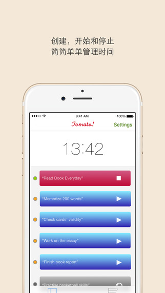想要更好地管理您的時間、細(xì)化每天的任務(wù)并停止半途而廢嗎?有了Tomato!,您的iPhone就變成了一個高效的時間管理器,并能助您在一天之中完成更多。創(chuàng)建一個計時器易如反掌。您可以選擇各樣的預(yù)設(shè)時間并且定制你想完成一個任務(wù)的次數(shù)。然后,您所建立的任務(wù)將會顯示在主頁中。在主頁里,您可以開始、打斷、恢復(fù)、標(biāo)記完成、刪除或查看一個任務(wù)的詳情。若您所標(biāo)記完成的任務(wù)沒有在7天內(nèi)恢復(fù),將會自動刪除。