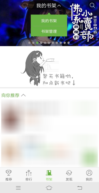 4.進(jìn)入主頁點(diǎn)擊我的書架選擇要看的書,如果沒有點(diǎn)擊下方的推薦