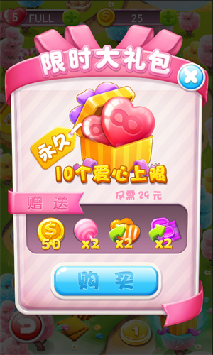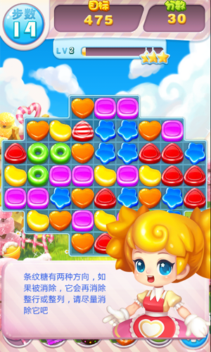《糖果大爆破》是一款三消類游戲,操作簡(jiǎn)單易上手,玩法豐富、關(guān)卡眾多。誘人的糖果元素、精美的特效畫面、可愛活潑的配音,讓您在空閑時(shí)間愛不釋手! 滑動(dòng)手指即可操作,讓三個(gè)及以上糖果排成一排或者一列就能消除;完成每關(guān)指定目標(biāo)即可過關(guān)!