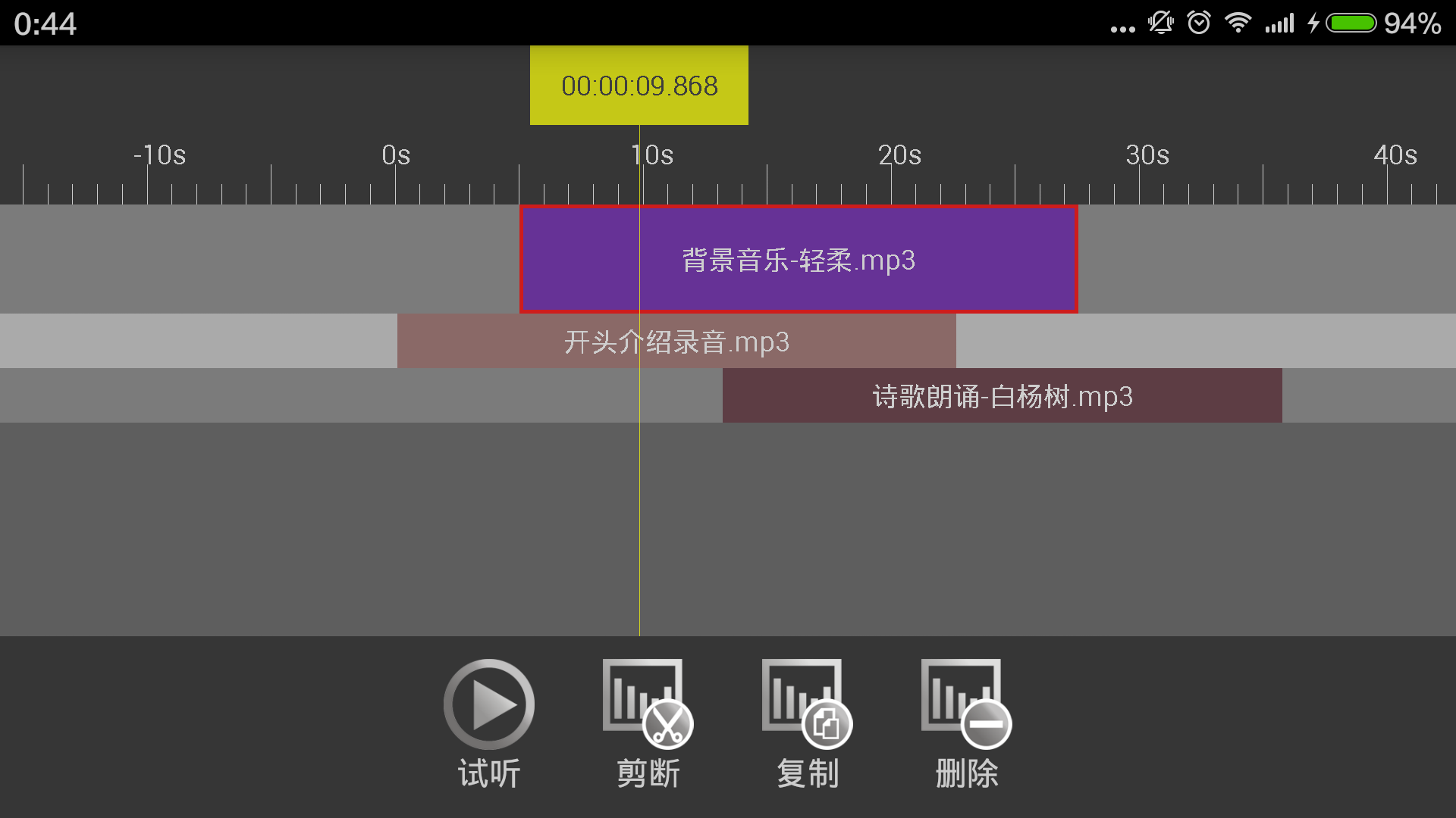 全網(wǎng)最直觀好用、完全免費的Android平臺音頻編輯器。1、支持音頻剪切、分割、拼接、疊加合成、錄音。