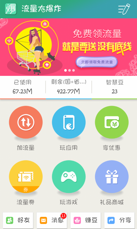 流量大爆炸是由安徽電信官方出品的兌換免費流量、查詢流量、訂購優(yōu)惠流量的手機應(yīng)用,專為安徽電信安卓手機用戶打造,用戶量過百萬的手機流量客戶端。