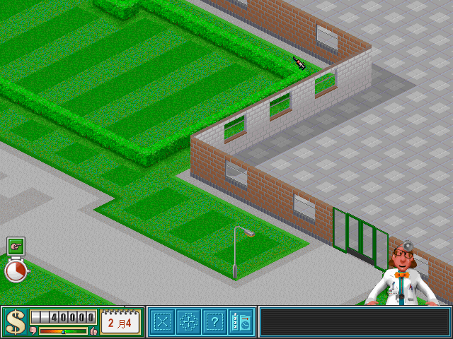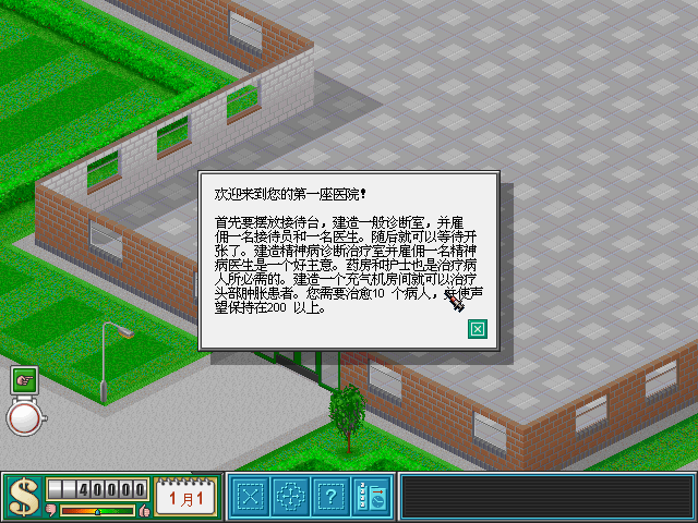 創(chuàng) 意:這個(gè)游戲一開始會(huì)給你50000元和一塊地皮,有些關(guān)還會(huì)配給你幾個(gè)醫(yī)生。最后要求達(dá)到一定的聲望,醫(yī)院價(jià)值及存款,還有治愈數(shù)。一關(guān)比一關(guān)要求高,而且每關(guān)會(huì)讓你建幾種房間,每關(guān)還會(huì)遇到不同的問題。是個(gè)設(shè)計(jì)出色的模擬經(jīng)營(yíng)游戲。
