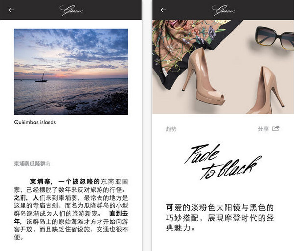 GUCCI Style,獨(dú)特的閱讀式購物體驗(yàn)雜志,帶給你獨(dú)特的時尚外觀,故事和引領(lǐng)奢侈品潮流的時尚者們。通過瀏覽豐富的視頻和華麗的圖片體驗(yàn)來購物各季的成衣和配飾。更有旅游,藝術(shù)和音樂的內(nèi)容供你閱覽。每周即時更新。有全球直營店導(dǎo)購、現(xiàn)場直播服裝秀?,F(xiàn)在你可以任意在iPhone或ipad上購買精品。Gucci 作為全球頂級精品品牌之一,以其敏銳的時尚觸覺以及無可比擬的意大利手工藝而聞名全球。