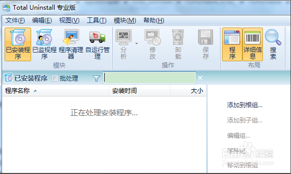 進(jìn)入軟件界面total_uninstall專業(yè)版,顯示正在處理安裝程序,大約需要等待1-2分鐘。