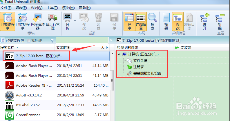 下面我們來試試卸載7Z軟件吧,這個(gè)比較小,小試牛刀一下。點(diǎn)擊左側(cè)7Z,出現(xiàn)正在分析提示