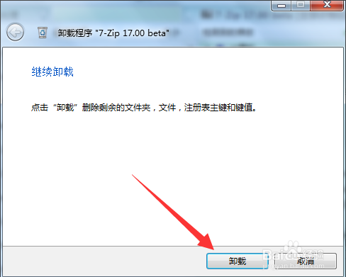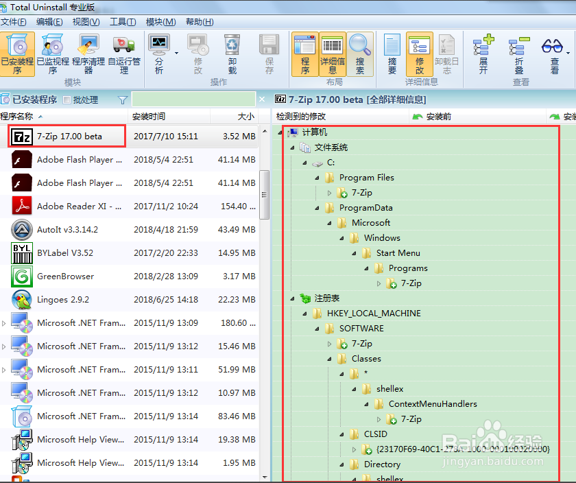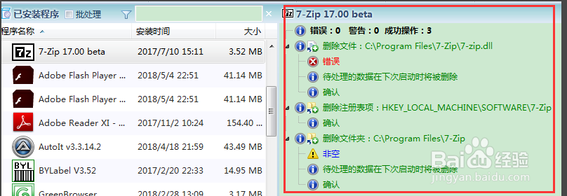 確定需要卸載左側(cè)7Z,右側(cè)所有的7Z的文件夾和注冊(cè)表大致是對(duì)的,點(diǎn)擊菜單頂上的卸載