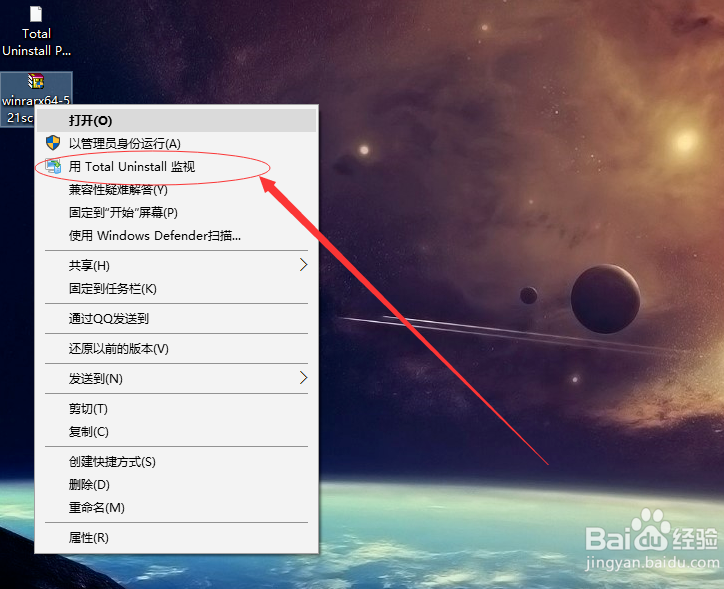 現(xiàn)在開始基本使用,主要介紹軟件監(jiān)控,現(xiàn)在你找一個(gè)安裝程序包(.exe結(jié)尾的文件)在上面右鍵會(huì)多出一個(gè)‘用Total Uninstall監(jiān)視’的選項(xiàng),點(diǎn)擊