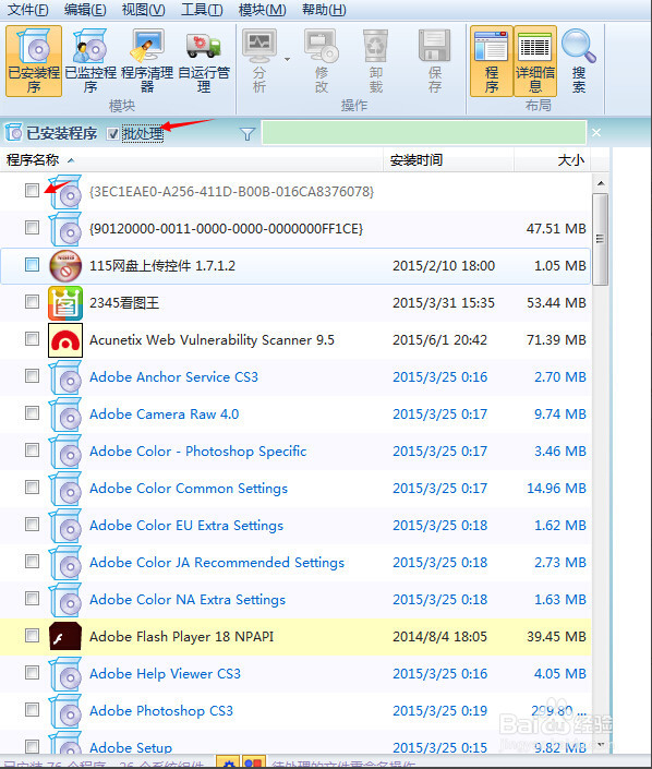 我們一個(gè)一個(gè)點(diǎn)擊卸載是不是很麻煩呢?沒關(guān)系,在Total已安裝程序右側(cè)有個(gè)批處理選項(xiàng),我們選中后每個(gè)軟件的左邊都會(huì)出現(xiàn)一個(gè)選擇框,我們把我們要卸載的軟件打上對(duì)勾,然后就可以進(jìn)行批量卸載啦
