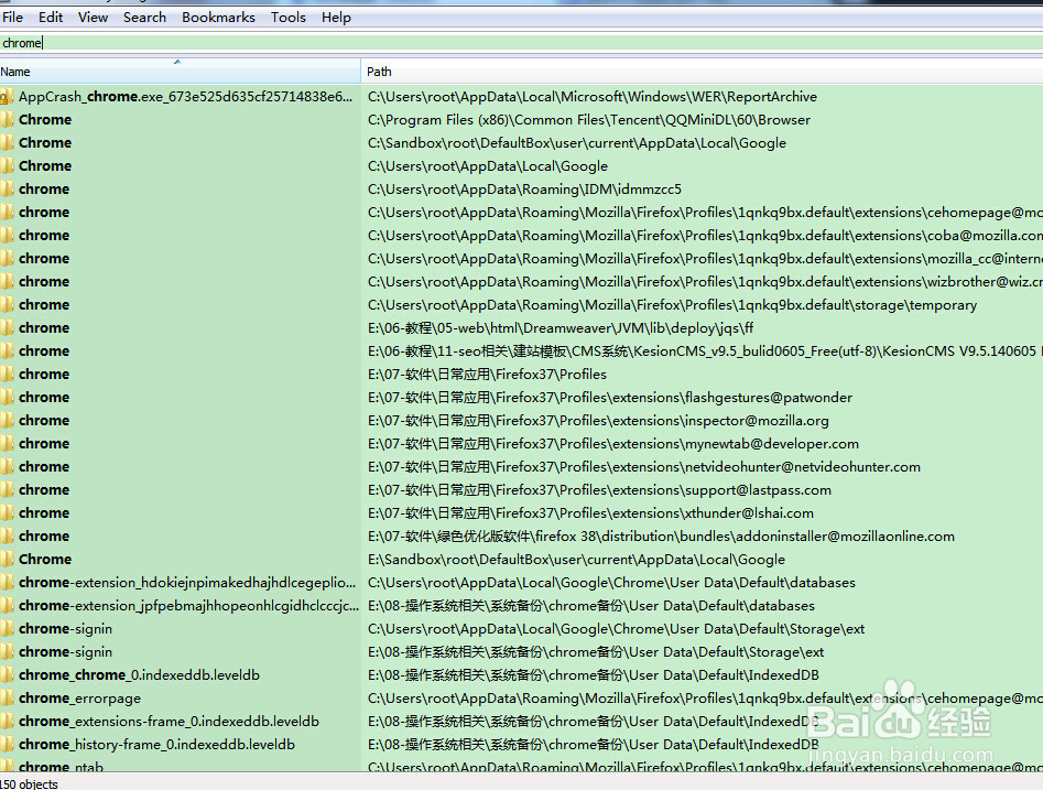 這就需要另外一個(gè)神奇啦,everything快速搜索神器,全盤搜索也不過十幾秒而已,我們要卸載chrome的話我們可以搜索chrome 看看結(jié)果中有沒有殘留的軟件。