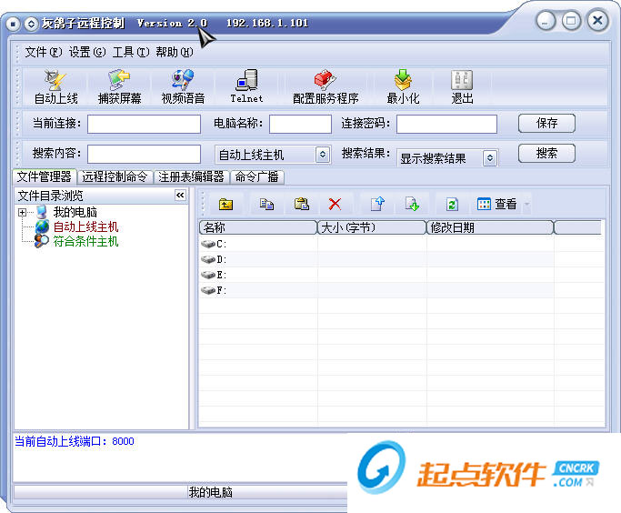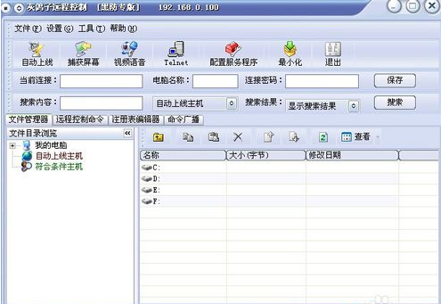 1、遠(yuǎn)程控制命令:查看遠(yuǎn)程系統(tǒng)信息、剪切板查看、進(jìn)程管理、窗口管理、插件功能、服務(wù)管理、共享管理、代理服務(wù)、MS-Dos模擬!2、捕獲屏幕:不但可以連繼的捕獲遠(yuǎn)程電腦屏幕,還能把本地的鼠標(biāo)及鍵盤傳動(dòng)作送到遠(yuǎn)程實(shí)現(xiàn)實(shí)時(shí)控制功能!
