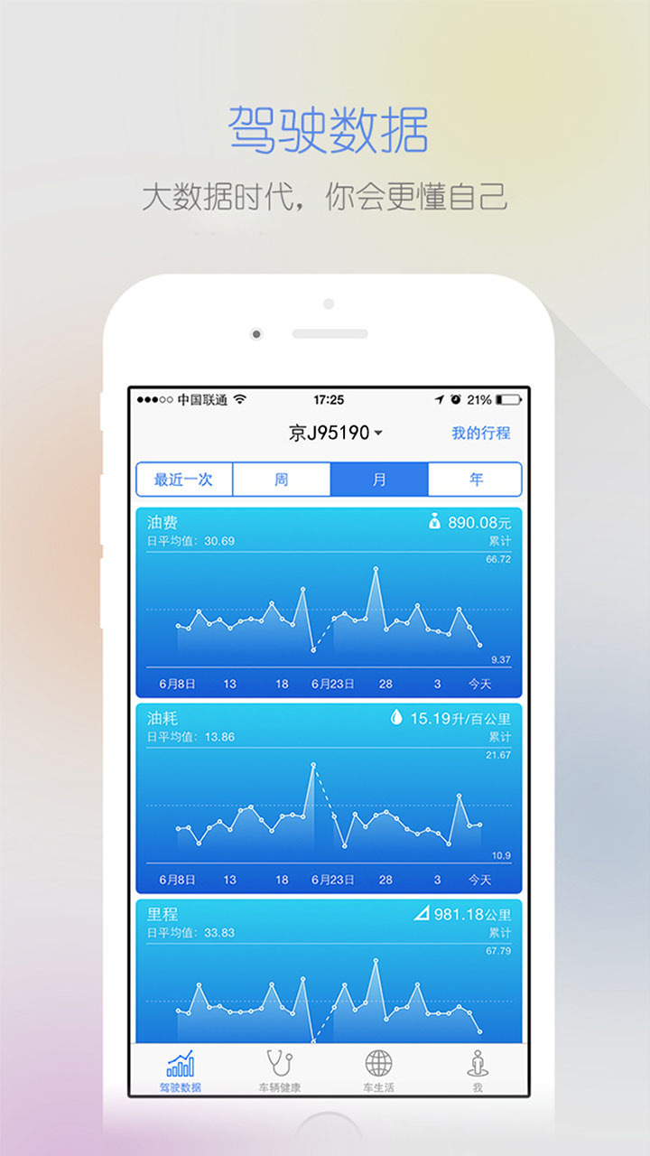 駕駛數(shù)據(jù)為您記錄每一次的車輛駕駛數(shù)據(jù),并針對油費、油耗、時間、里程、碳排放等項進行按周、月、年的數(shù)據(jù)趨勢曲線分析。