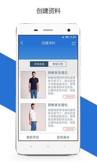 【快速的人體姿勢健康評估】 通過正面和側(cè)面兩幅自然站立下的照片,在雙眼、肩膀、骨盆、膝蓋及雙腳點擊幾個點,可以在 20 秒告訴您身體姿勢的健康狀況;【個性化的運動康復和健身訓練方案】 根據(jù)姿勢評估結(jié)果和疼 痛部位,通過公司醫(yī)學專家團隊自行開發(fā)的核心算法,為您提供個 性化的運動康復與健身訓練方案。