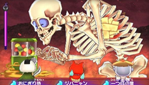 妖怪手表另一個(gè)有趣的地方就是BOSS對(duì)戰(zhàn)了。以第一個(gè)遇到的BOSS扭蛋骷髏為例。一個(gè)攜帶著扭蛋機(jī)的巨大骷髏,攻擊方式居然是通過投幣轉(zhuǎn)扭蛋來決定使用什么招式。比如綠色扭蛋是給我方加血。你沒有看錯(cuò),是給我方。紅色扭蛋是使用火屬性妖術(shù),而金色扭蛋出來后BOSS則會(huì)釋放大招。BOSS戰(zhàn)與一般的3V3不太一樣,趣味性和震撼程度會(huì)更高。