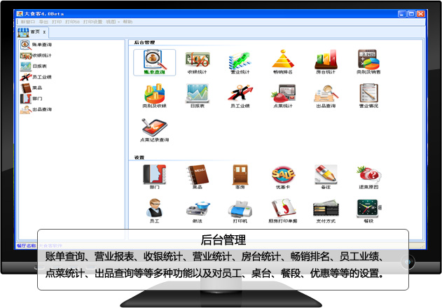 3.后臺管理系統(tǒng):后臺管理為銷售與收入狀況的查看、核對、查詢、統(tǒng)計與分析;對員工的工作業(yè)績考核。管理人員很方便對酒店運作進行管理,設置菜品、房臺、員工賬號、收入方式、折扣、廚房打印等。