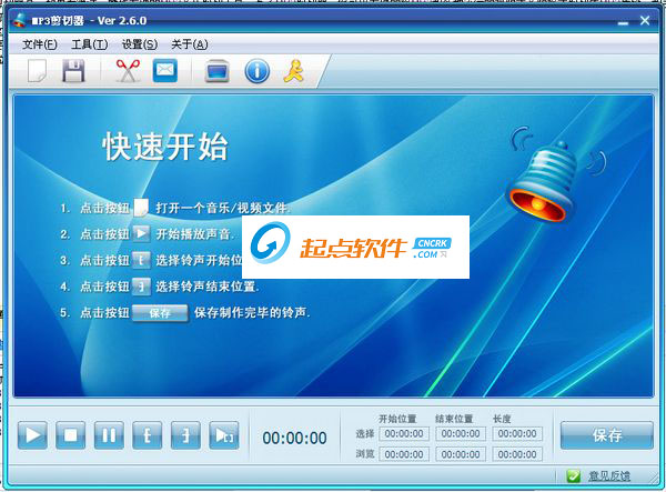 4、下方功能圖標(biāo)分別是:“播放”、“停止”、“暫?!薄ⅰ斑x擇鈴聲起始位置”、“選擇鈴聲結(jié)束位置”、“播放選擇段落”。