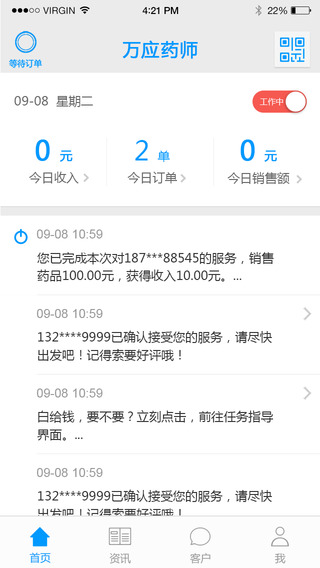 萬應(yīng)藥師(萬應(yīng)送藥藥劑師版),為藥劑師量身打造。讓所有藥劑師每月都可以增收至少4000元,輕松實(shí)現(xiàn)收入翻一番!【軟件功能】