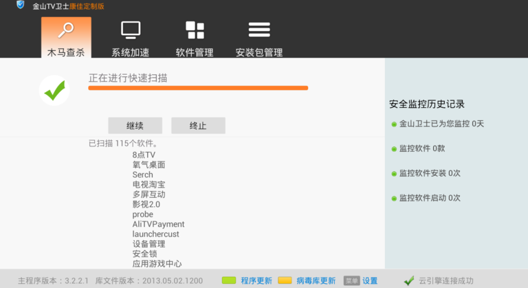 金山衛(wèi)士是一款由金山網(wǎng)絡技術有限公司出品的查殺木馬能力強、檢測漏洞快、體積小巧的免費安全軟件。它采用金山領先的云安全技術,不僅能查殺上億已知木馬,還能5分鐘內發(fā)現(xiàn)新木馬;漏洞檢測針對電視優(yōu)化,速度更快;更有實時保護、插件清理,全面保護電視的系統(tǒng)安全。【軟件功能】
