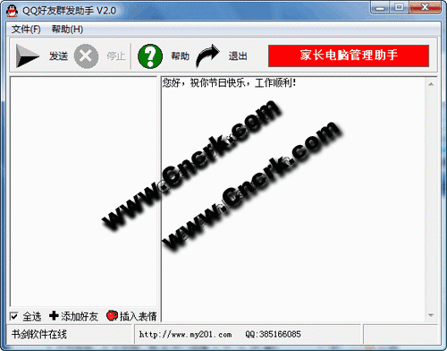 本軟件為免費、綠色軟件,能很方便的把QQ信息群發(fā)給您的好友。使用它可以給您的朋友發(fā)送節(jié)日祝賀信息,或給員工發(fā)送通知及客戶發(fā)送產(chǎn)品信息等