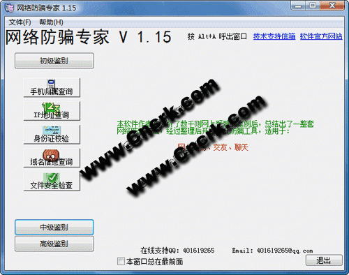 中國(guó)今天的互聯(lián)網(wǎng)存在著最大的問題是什么?40%的人說是產(chǎn)品質(zhì)量、服務(wù)售后、得不到廠商的保障。25%的人說,網(wǎng)上的信息不真實(shí)。70%的人說安全性得不到保障。確實(shí)是這樣,互聯(lián)網(wǎng)本身的特性決定了它在提供給我們種類豐富、價(jià)格低廉的大量商品的同時(shí),也給各種形形色色的騙子提供了一個(gè)表演的舞臺(tái),隨處可見的是騙子們活躍的身影。怎么才能在網(wǎng)上安全地進(jìn)行購(gòu)物和交友呢?根據(jù)犯罪心理學(xué),我們?cè)诜治隽藬?shù)千則網(wǎng)上受騙案例后,總結(jié)出一整套網(wǎng)絡(luò)防騙方法,經(jīng)過整理后開發(fā)了此防騙工具軟件。