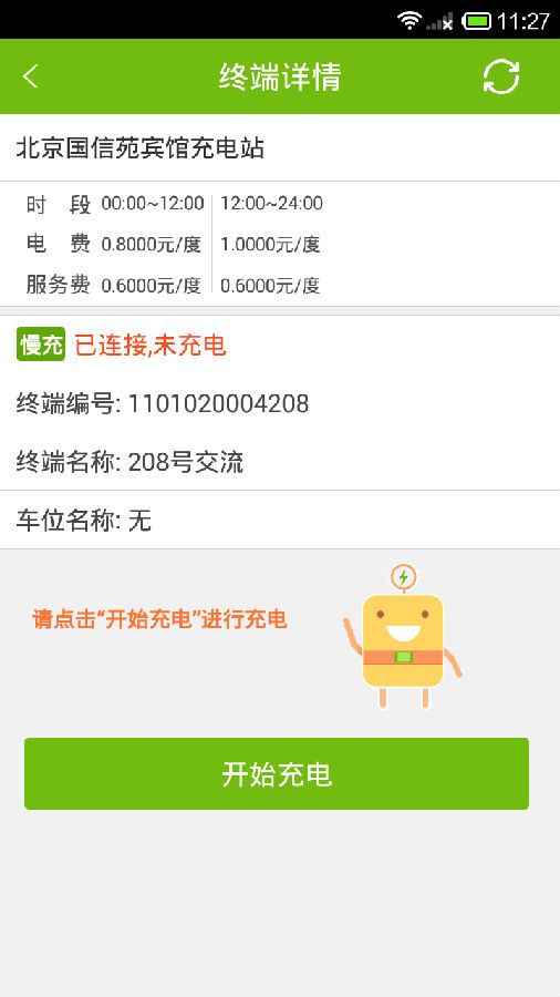 掃描成功進入終端詳情頁面,點擊“立即充電”按鈕,隨即進入“充電中”界面。