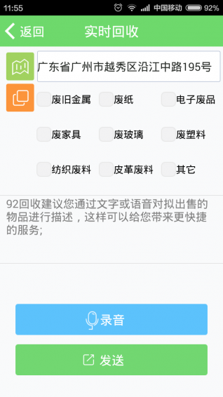 92回收是一款手機垃圾回收服務(wù)軟件,要想廢物在利用造福于民,要想我們生活的環(huán)境更美麗空氣更好,那就一定要做好垃圾的分類回收,所有92回收來幫助你輕松實現(xiàn)回來實現(xiàn)垃圾分類,讓人人都能自覺做到這一切,改變就在一瞬間。【軟件特點】