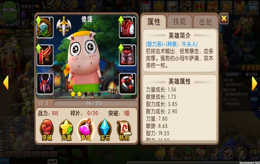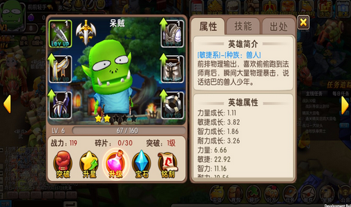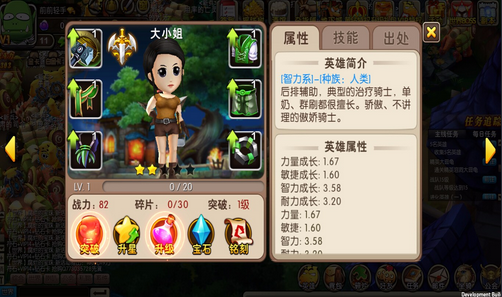 英雄界面中有英雄的詳細屬性,還可以查看裝備、技能、英雄來源以及未獲得的英雄、已經(jīng)獲得英雄。英雄有白,綠,藍,紫四個品質(zhì),達進階所需的等級、裝備的條件后便可突破,進階后伙伴形象會略有變化。每個英雄都有不同的技能,除了一個手動技能外還有兩個非手動技能,公測還將開放第四個技能。通過技能點可以提升技能等級。