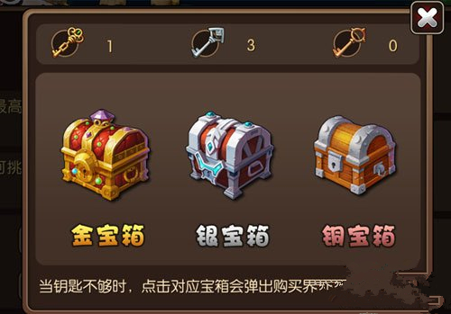 在主界面點擊“寶物”的按鈕可以進行挖寶活動,副本界面戰(zhàn)斗過程中獲得的寶箱鑰匙可以在寶箱界面中打開寶箱,獲得各種獎勵。