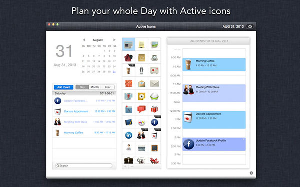ActiveIconsMac版是一款MacOS平臺(tái)上的日程管理軟件。ActiveIcons跟其他日程表軟件不同的是,它提供大量豐富的圖標(biāo),這樣就可以通過(guò)圖標(biāo)很直觀(guān)的看到自己接下來(lái)所要做的事情。