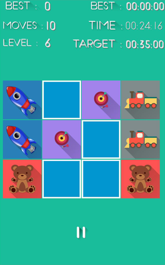 該游戲是相當(dāng)容易,因?yàn)槟憧梢愿鶕?jù)數(shù)量的卡翻轉(zhuǎn)水平。每個(gè)卡具有在其上從五個(gè)類別之一選為上面寫卡的另一側(cè)的物體。當(dāng)你點(diǎn)擊卡上的翻轉(zhuǎn),并顯示你的形狀。然后,你必須要找到這也是隱藏在另一個(gè)插卡同一對(duì)象。