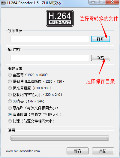 下載解壓后,運行 h264encoder.exe 打開軟件,分別選擇您要轉(zhuǎn)換的視頻文件,以及轉(zhuǎn)換后文件存放的目錄