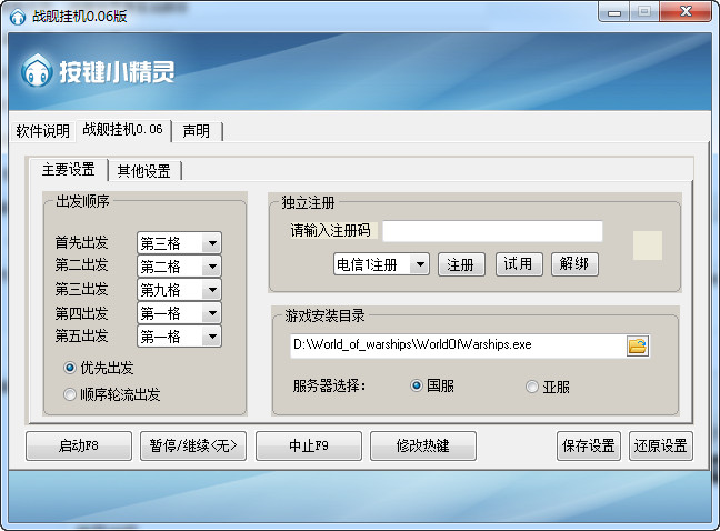 戰(zhàn)艦世界青菜蟲腳本是一款關(guān)于射擊精品大作《戰(zhàn)艦世界》的免費掛機輔助腳本。目前腳本只能掛CV.不要有其他標題為“戰(zhàn)艦世界”的窗口,否則腳本可能誤判。【軟件使用方法】
