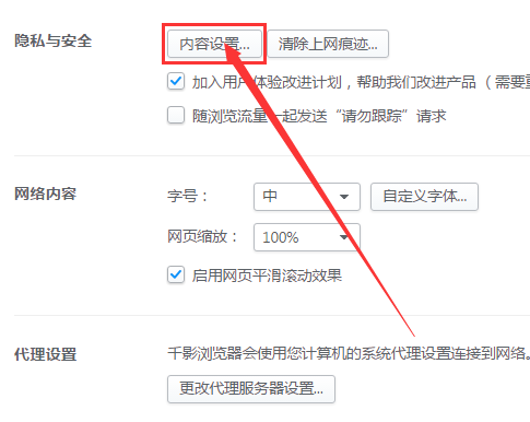 進(jìn)入上面頁(yè)面后,找到隱私與安全-〉內(nèi)容設(shè)置,如下圖所示點(diǎn)擊內(nèi)容設(shè)置