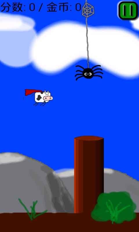 《超級牛牛跑酷》是一款很有趣的游戲,類似flappy bird(笨鳥先飛或飛翔的小鳥),游戲中玩家必須控制一只小牛,跨越由各種不同長度木樁所組成的障礙。注意不要被蜘蛛等危險動物碰到哦??吹教炜盏粝聛淼慕饚炮s快收集,收集到5個金幣可以讓你復(fù)活一次哦??靵肀缺日l能通關(guān)吧。