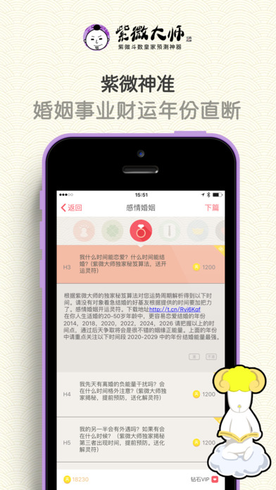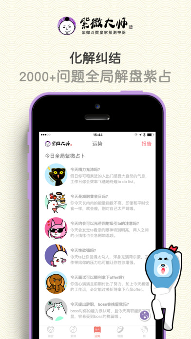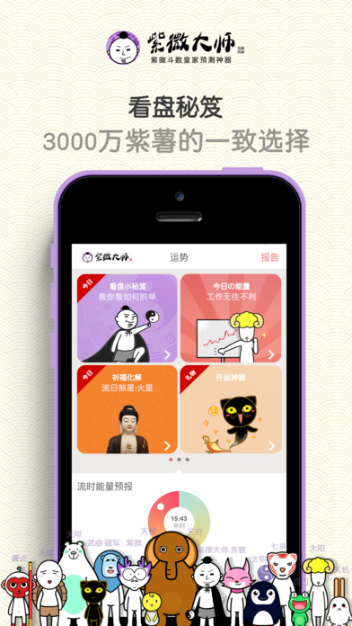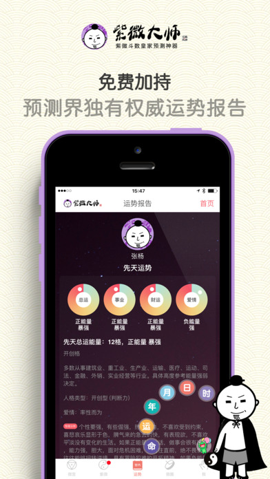 紫微大師app是一款測(cè)算超準(zhǔn)的紫微算命軟件。紫微大師iPhone版中其中包括命盤、解盤、紫微占卜、運(yùn)勢(shì)解碼、帝王合婚五大模板,你可以根據(jù)自己的需要來選擇算命功能。因?yàn)樵撥浖y(cè)算過于精準(zhǔn),心理承受弱的朋友請(qǐng)謹(jǐn)慎使用。