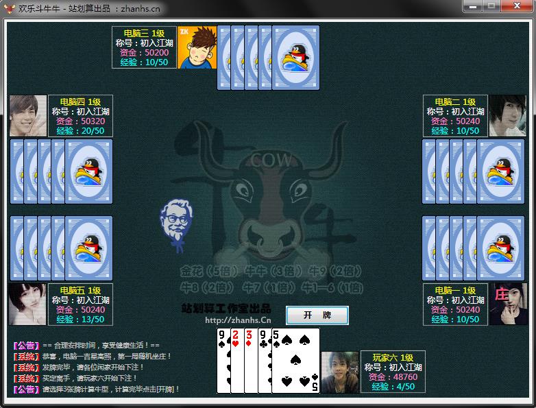 《歡樂斗牛牛》是騰訊游戲推出的一款桌面休閑撲克游戲,這款游戲擁有速度快、緊張刺激等特點,主要流行在湖南、廣東、廣西地區(qū)。小編今天帶來的是歡樂斗牛牛單機版,這款游戲玩法簡單,斗智斗勇,深受很多休閑玩家的喜歡,歡樂斗牛牛分為:看牌搶莊、隨機莊家、世界大戰(zhàn)。【游戲玩法特點】