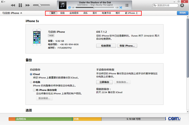 連接設(shè)備之后,在iTunes的右上部分就會(huì)出現(xiàn)設(shè)備的圖標(biāo),點(diǎn)擊它我們就進(jìn)入到了設(shè)備管理模式。在頂部我們能看到“摘要”、“信息”、“應(yīng)用程序”、“音樂(lè)”、“影片”、“電視節(jié)目”、“照片”、“此iPhone上”這幾個(gè)標(biāo)簽。