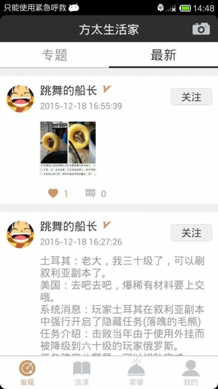2.發(fā)現(xiàn)界面有專題菜譜和最新界面類似朋友圈功能