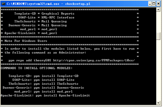 一定要檢查是否安裝完成了所有的per模塊l,因?yàn)橛械膒erl模塊是要基于已經(jīng)安裝的perl模塊的,所以第一次安裝完成后最好再運(yùn)行一次checksetup.pl