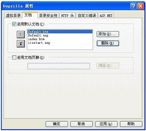 在bugzilla屬性對(duì)話框中選擇文檔,在默認(rèn)文檔中選中添加