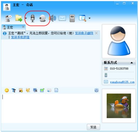 打開會(huì)話窗口,點(diǎn)擊語音或視頻會(huì)話圖標(biāo)即可開始會(huì)話。