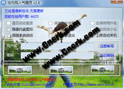 為了防止大量刷人氣行為,校內(nèi)網(wǎng)限制了每位用戶每天的人氣上限為350-800左右,所以超過(guò)上限后個(gè)人校內(nèi)主頁(yè)上只會(huì)顯示到訪用戶頭像而訪問(wèn)人氣不會(huì)增加.<<校內(nèi)網(wǎng)人氣精靈 v2.4>>采用軟件在線用戶互踩互刷人氣的方法,輕松讓您每天的人氣迅速增加350-800(根據(jù)每天校內(nèi)設(shè)定的上限而不同).新版的<<校內(nèi)網(wǎng)人氣精靈 v2.4>>采用自動(dòng)識(shí)別驗(yàn)證碼的技術(shù),免除您每訪問(wèn)100個(gè)用戶頁(yè)面就得輸入一次驗(yàn)證碼的麻煩.配合跟隨系統(tǒng)啟動(dòng),自動(dòng)登錄互踩,達(dá)到人氣上限時(shí)自動(dòng)關(guān)閉軟件等功能,完全實(shí)現(xiàn)傻瓜化自動(dòng)控制,無(wú)需您的任何干預(yù),每天輕松自動(dòng)刷人氣~_~