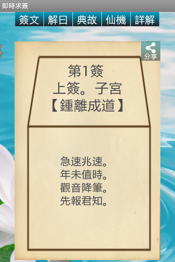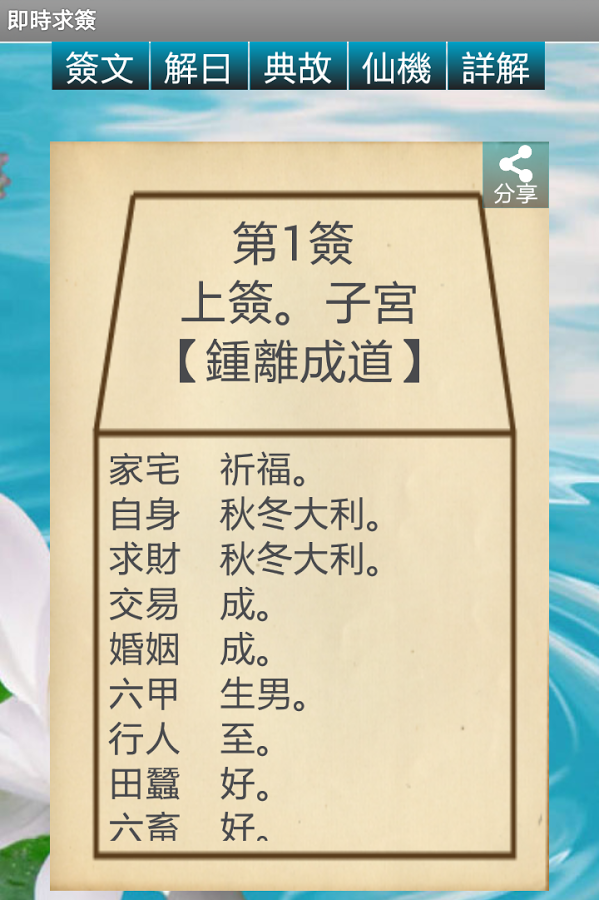本免費軟件支援繁體簡體,并提供求簽、查解簽文、詳解、仙機及記載。另外,本軟件支援分享功能,可以將簽文跟家人朋友分享。