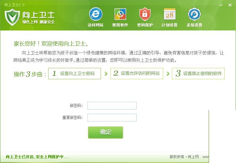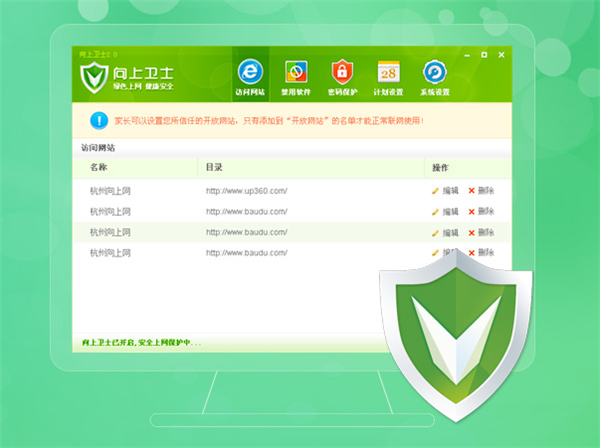 向上衛(wèi)士為學(xué)生創(chuàng)造一個(gè)綠色健康的網(wǎng)絡(luò)環(huán)境,保護(hù)孩子視力,培養(yǎng)學(xué)生良好的上網(wǎng)習(xí)慣,通過(guò)正確的引導(dǎo),避免有害信息對(duì)學(xué)生的侵蝕,讓網(wǎng)絡(luò)真正成為學(xué)習(xí)成長(zhǎng)的好助手!