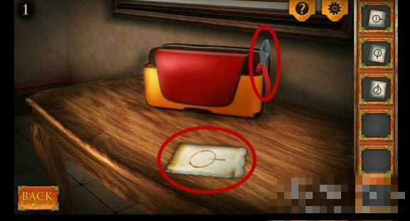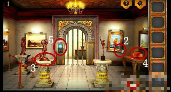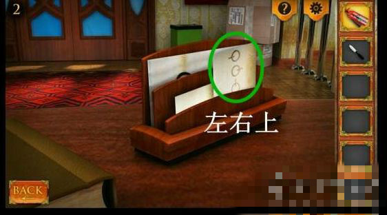 依次點(diǎn)擊紅圈所示5處地方,首先撿起上1號(hào)圈所示的第1頁(yè)紙,最后點(diǎn)擊門左邊的控制板。