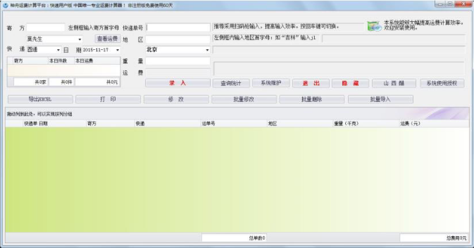 神舟運(yùn)費(fèi)計(jì)算平臺(tái)(快遞用戶版)是專門針對(duì)快遞企業(yè)設(shè)計(jì)開發(fā)的一款運(yùn)費(fèi)計(jì)算工具。你只需要通過“條碼槍掃描”、“輸入地址首字母”、“輸入重量值”三步操作即可計(jì)算快遞費(fèi)用,并輕松實(shí)現(xiàn)累加,你甚至只需要通過 Excel 表導(dǎo)入數(shù)據(jù)就能算出快遞費(fèi)。所有費(fèi)用能夠?qū)崟r(shí)求和統(tǒng)計(jì)和存檔,經(jīng)實(shí)際使用檢驗(yàn),該平臺(tái)能介紹快遞計(jì)算時(shí)間70%以上,是淘寶店主,快遞企業(yè)運(yùn)費(fèi)計(jì)算的好幫手!