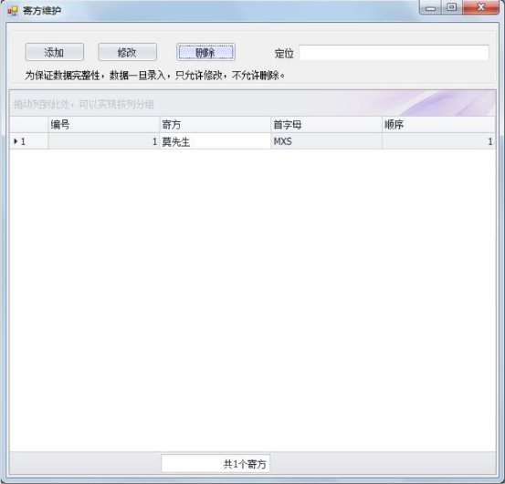 點(diǎn)擊寄方維護(hù)可以進(jìn)行寄方信息的維護(hù)。在定位中輸入寄方或寄方首字母,可以準(zhǔn)確定位到該寄方信息。